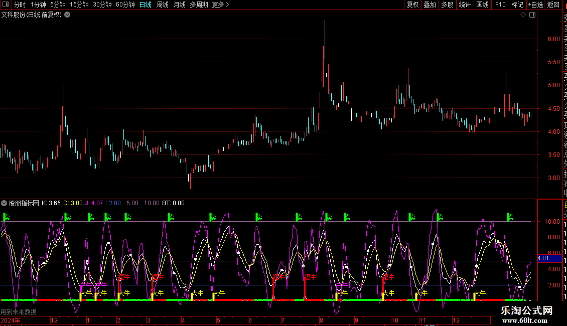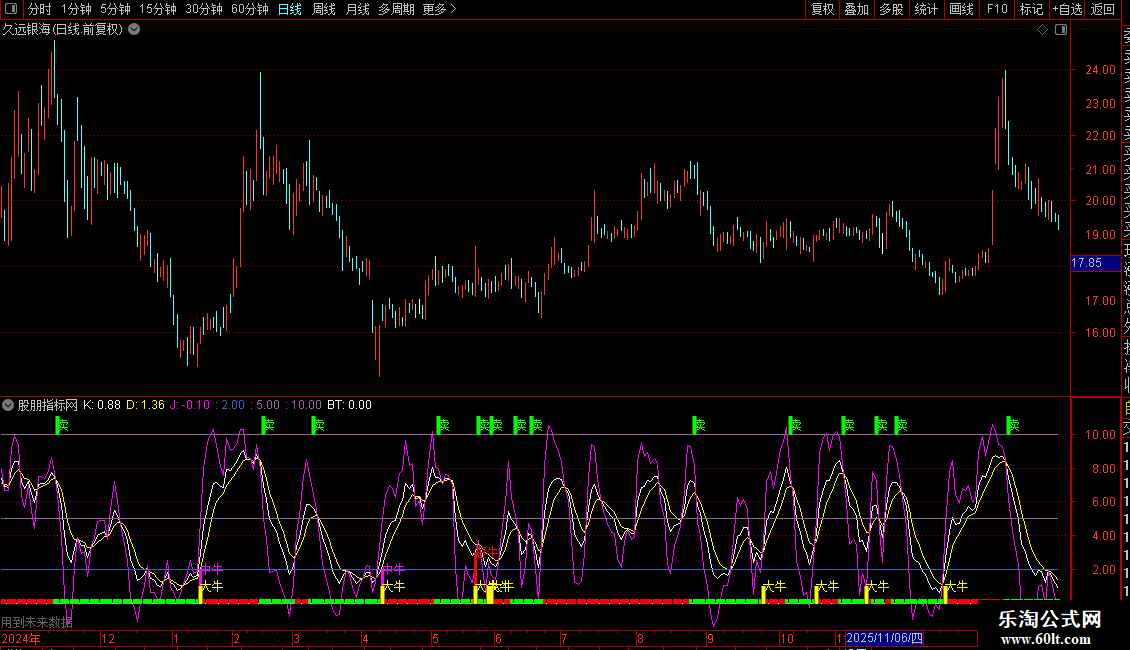 1. 副图指标:在副图区域显示K、D、J线,以及“短牛”、“中牛”、“大牛”买入信号和“卖”出信号。