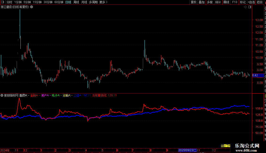 在K线图主图区域,绘制了5条重要的行业“基准线”(金融、地产、医药、农林、运输),以及上证指数和个股自身的“当前猎狼线”。
