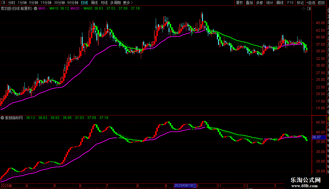 指标通过多条复合均线的预测值及其颜色变化,来展示不同时间维度下价格的趋势方向(洋红色代表向上,绿色代表向下)。