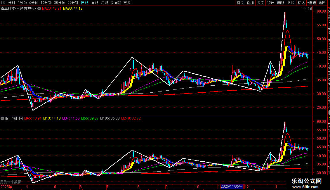 使用白色粗线连接这些有效的高点和低点,在图表上形成类似“分形”或“波浪”的趋势通道线。