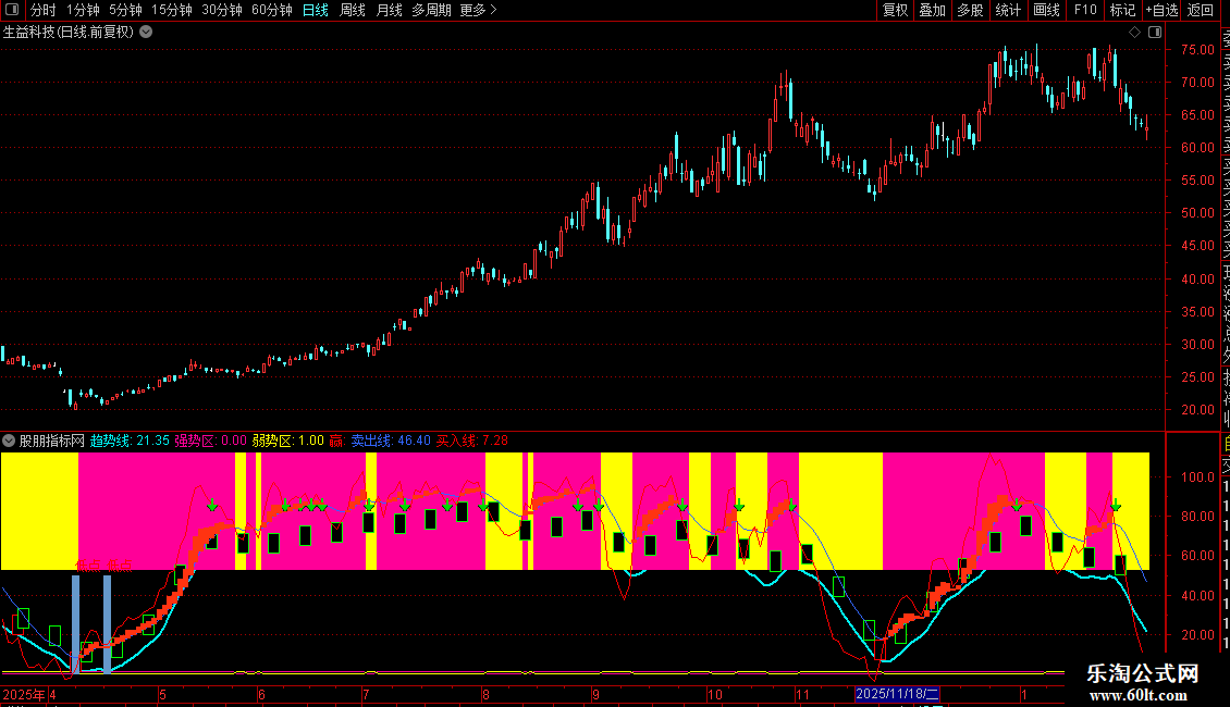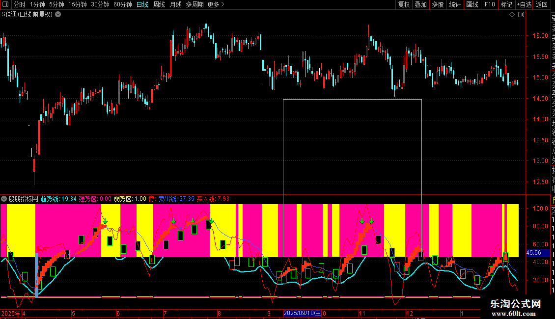 “强势区/弱势区”柱状带提供直观的多空背景。