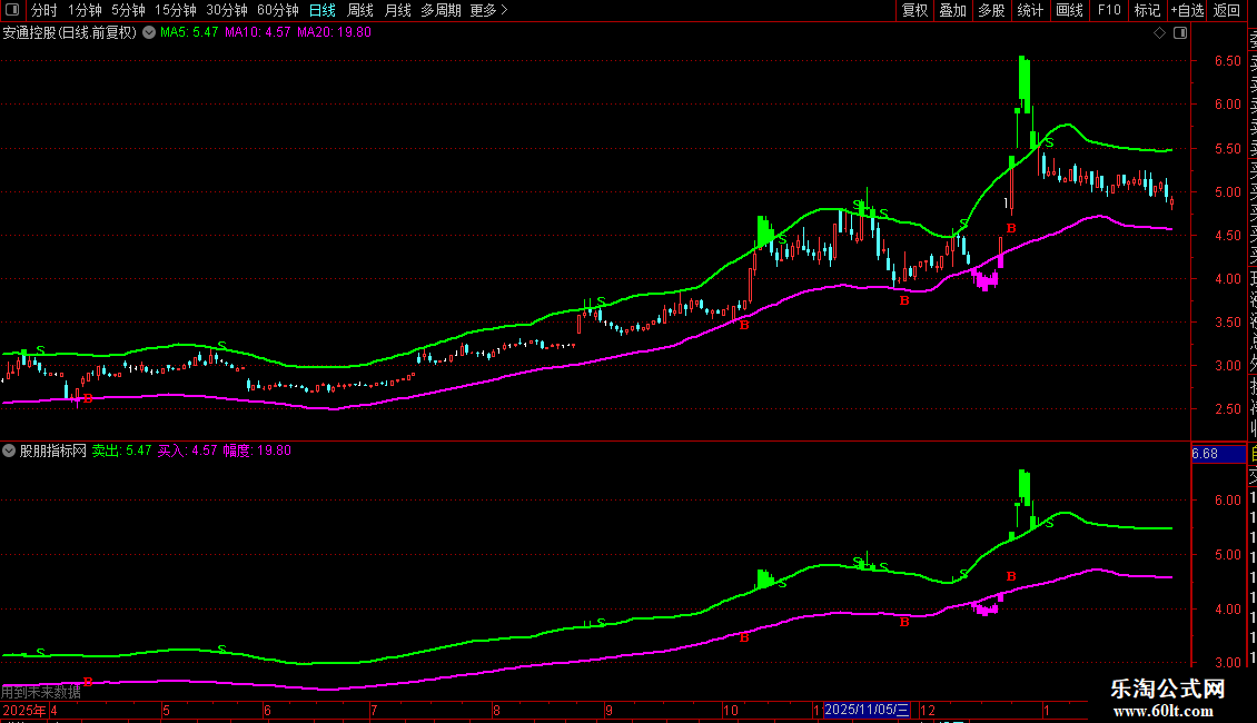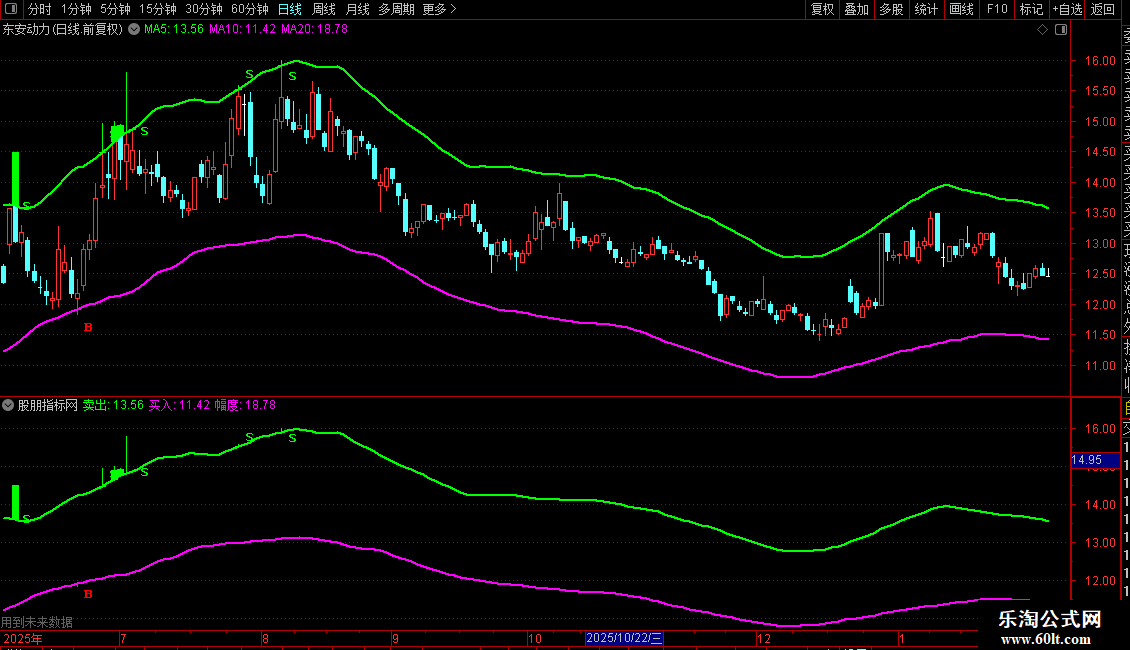 指标构建了一个由“买入线”和“卖出线”组成的通道。其核心视觉逻辑是,通过K线染色的变化,直观展示价格在通道内外的波动。当价格触及或突破下轨(买入线)时,可能产生买入信号(B);当价格触及或突破上轨(卖出线)时,可能产生卖出信号(S)。使用者可观察K线颜色变化与信号标记,结合通道宽度(幅度)来辅助判断市场状态和交易时机。