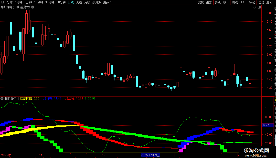 2. 趋势跟踪:以`中线持有`与`中线出货`线的相对位置及对应柱色(蓝/红)作为中期持仓的主要依据。蓝色柱区域可考虑持有或寻找机会,红色柱区域应注意控制风险。