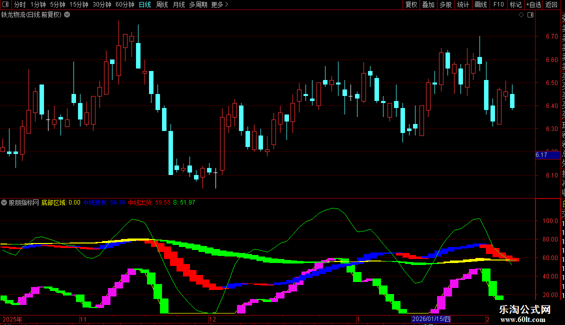 持有:洋红色柱线。当`底部区域`值较前一日上升时绘制,提示可能处于底部构筑或上涨初期,可考虑持有或关注。