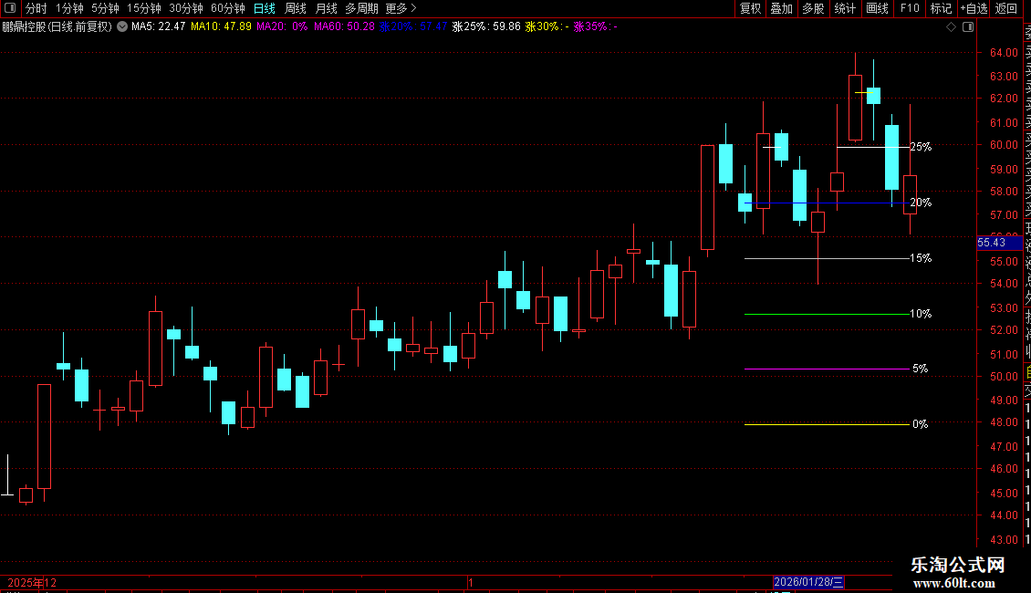 3. 根据股价波动,在达到相应涨幅位置时,绘制对应的水平线并标注涨幅百分比(如5%、10%等)。