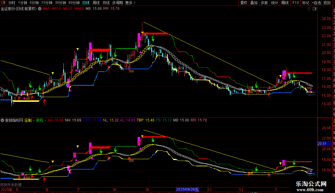 压制线(黄色):连接过去60日最高收盘价对应的高点与30日(非45日)最高收盘价对应的高点形成的压力线。