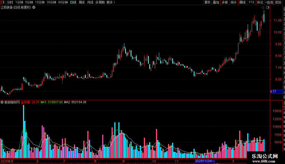 主动卖盘赋值:如果收阳线,返回0-VAR1*((最高价-收盘价)+(开盘价-最低价)),否则返回如果收阴线,返回0-VAR1*(最高价-最低价),否则返回0-成交量(手)/2STICK,线宽为2