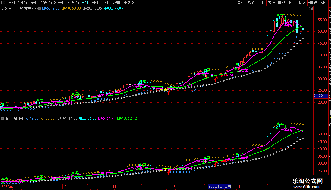 卖1:=IF(HHV(DX,2)=HHV(DX,7) AND COUNT(DX>50,2) AND CROSS(MA(DX,2),DX),1,0);