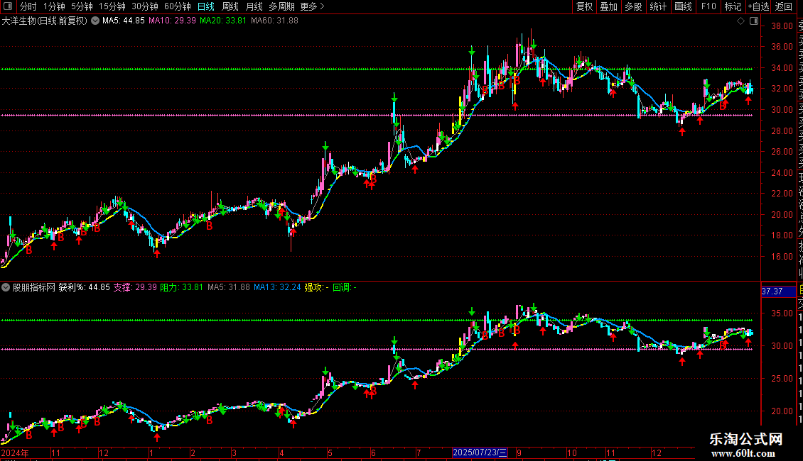 回调:IF(MA3<REF(MA3,1) AND MA3>0,MA13,DRAWNULL),COLORGREEN,LINETHICK2;