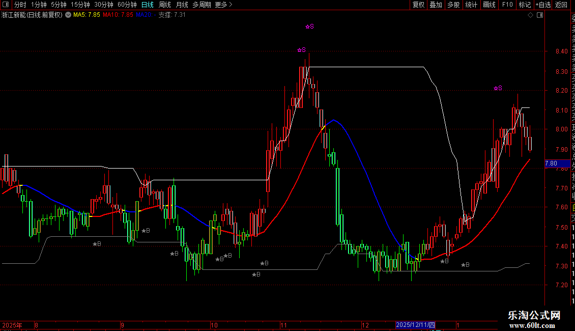 A:=AMOUNT/V/100;VARA:=EMA((((A-EMA(A,13))/EMA(A,13))*(0-100)),5);操盘线:=EMA(((VARA/10)+EMA(A,10)),3);行情线:=EMA(A,3);重心:= (C+0.618*REF(C,1)+0.382*REF(C,2)+0.236*REF(C,3)+0.146*REF(C,4))/2.382;趋势线:EMA(((SLOPE(C,22)*20)+C),55),COLORYELLOW,LINETHICK2;红升:IF(重心>=趋势线,趋势线,DRAWNULL),COLORRED,LINETHICK2;蓝降:IF(重心<趋势线,趋势线,DRAWNULL),COLORBLUE,LINETHICK2;STICKLINE(行情线<操盘线,H,L,0,1),COLORGREEN;STICKLINE(行情线<操盘线,C,O,2,1),COLORGREEN;STICKLINE(行情线>=操盘线,H,L,0,1),COLORRED; STICKLINE(行情线>=操盘线,C,O,2,1),COLORRED;压力:MA(REF(HHV(C,30),1),2),COLORWHITE;支撑:MA(REF(LLV(C,30),1),2),COLORGRAY; DA:=(EMA(C,1)+EMA(C,2)+EMA(C,3)+EMA(C,4))/4;DB:= (EMA(C,10)+EMA(C,20)+EMA(C,40)+EMA(C,80))/4;DRAWTEXT(CROSS(DA- DB,0),L*0.98,'★B'),COLORGRAY;JH:=SMA(MAX(C-REF(C,1),0),5,1)/SMA(ABS(C- REF(C,1)),5,1)*100;DRAWTEXT(CROSS(84,JH),H*1.02,'☆S'),COLORMAGENTA;涨停:=IF((C-REF(C,1))*100/REF(C,1)>=(10-0.01*100/REF(C,1)),1,0); STICKLINE(涨停,O,C,2,0),COLORRED;跌停:=IF((REF(C,1)-C)*100/REF(C,1)>= (10-0.01*100/REF(C,1)),1,0);STICKLINE(跌停,O,C,2,1),COLORGREEN;