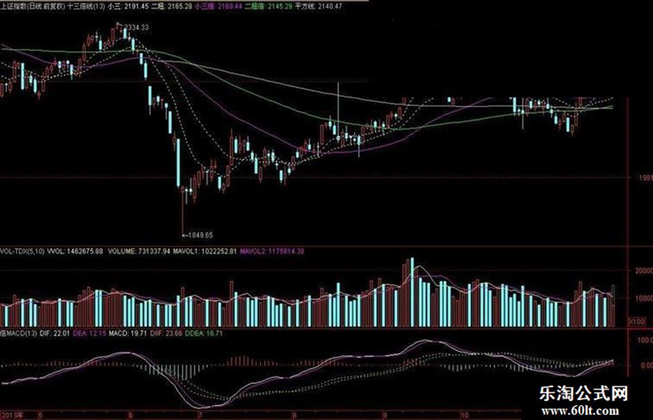 n:=13; 小三:EMA(WMA(C,N),1),DOTLINE; 二妞:EMA(WMA(C,2*N),2),DOTLINE; 小三倍:EMA(WMA(C,4*N),4); 二妞倍:EMA(WMA(C,8*N),8); 平方线:EMA(WMA(C,13*N),13);