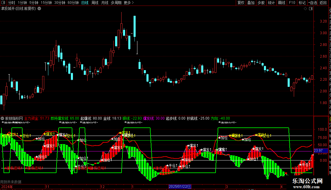 DRAWTEXT(CROSS(主力资金,即将爆发线),主力资金,'★加仓') ,COLORWHITE;