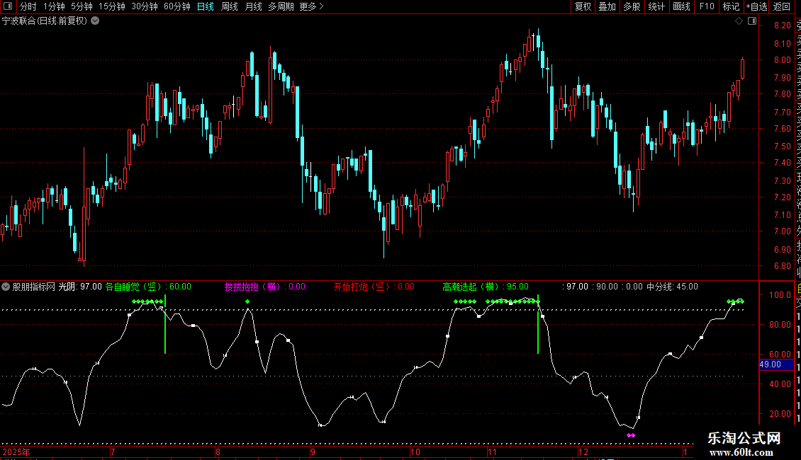 各自睡觉(竖): IF(LONGCROSS(VAR2,VAR1*0.95,7) AND VAR1>60,100,60),COLOR00FF00,STICK,LINETHICK2;