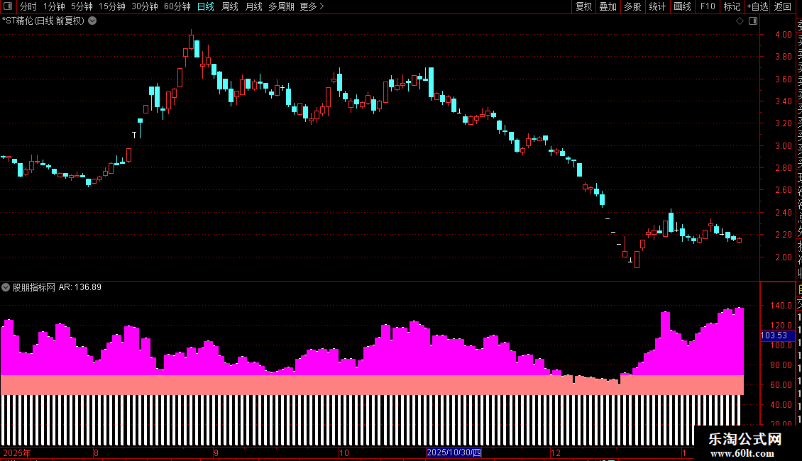 AR :SUM(HIGH-OPEN,N)/SUM(OPEN-LOW,N)*100,STICK,COLORWHITE,LINETHICK4;