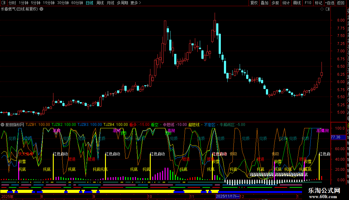中短线:IF(AJ>AD,-10,DRAWNULL),LINETHICK2,COLORCC66FF;
