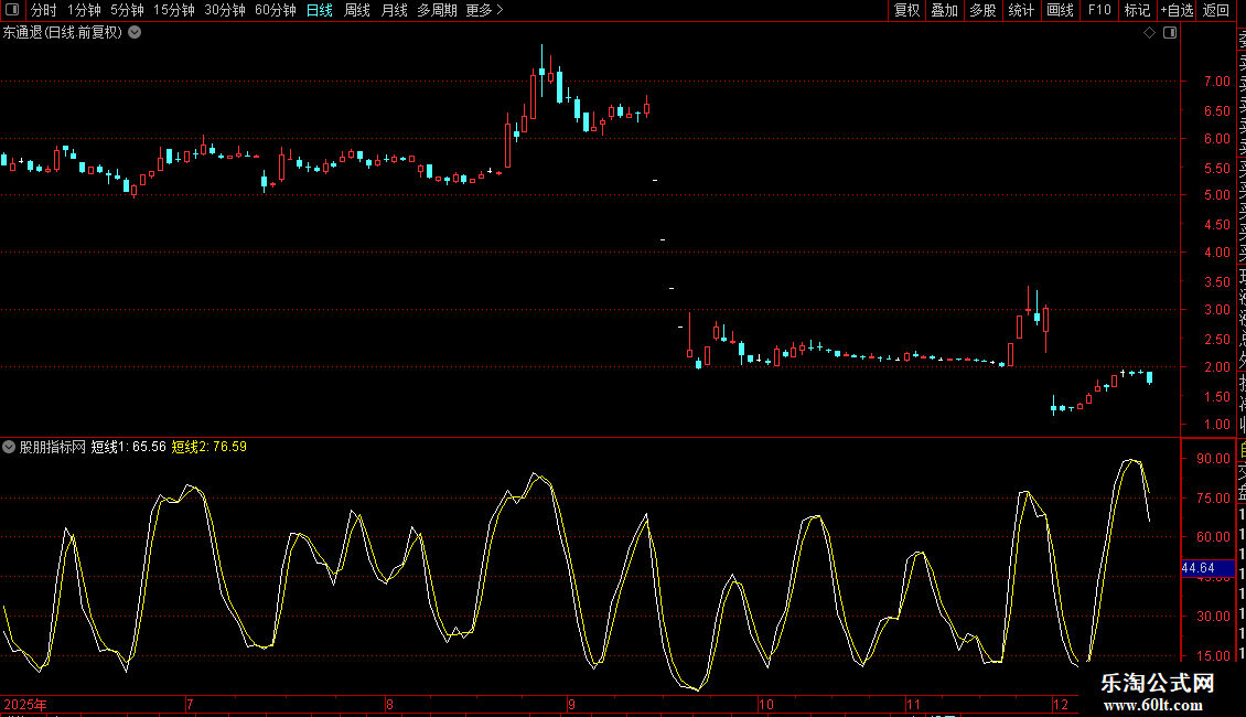 当白线从下向上穿过黄线,且两者的交叉点小于35的时候,尾盘跟进。