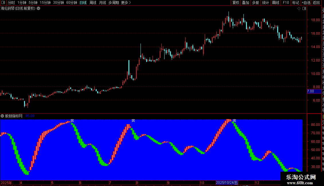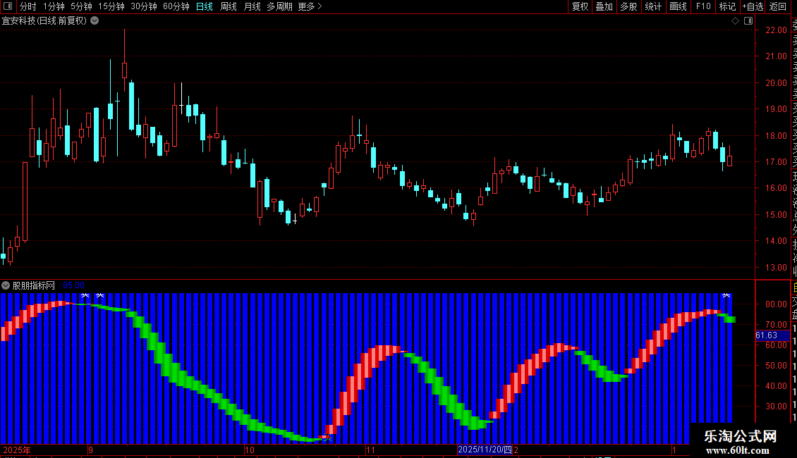 当满足条件K上穿DAND(D<18)时,在15位置书写文字,COLOR00FF00