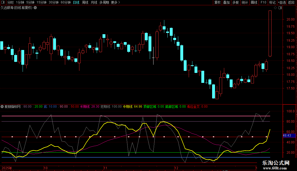 低位金叉:50*(长期线<15 AND REF(长期线,1)<15 AND 中期线<18 AND 短期线>REF(短期线,1) AND CROSS(短期线,长期线) AND 短期线>中期线
