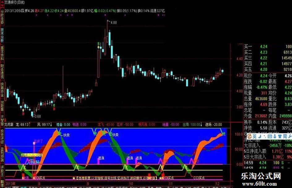 DRAWTEXT(CROSS(龙D,龙) AND 龙>70,50,'卖'),COLORGREEN;