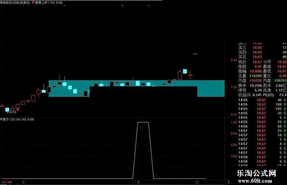 说明:股价在120日线和240日线之间横盘整理3周以上,突然突破前高线,将有20%以上的收益;