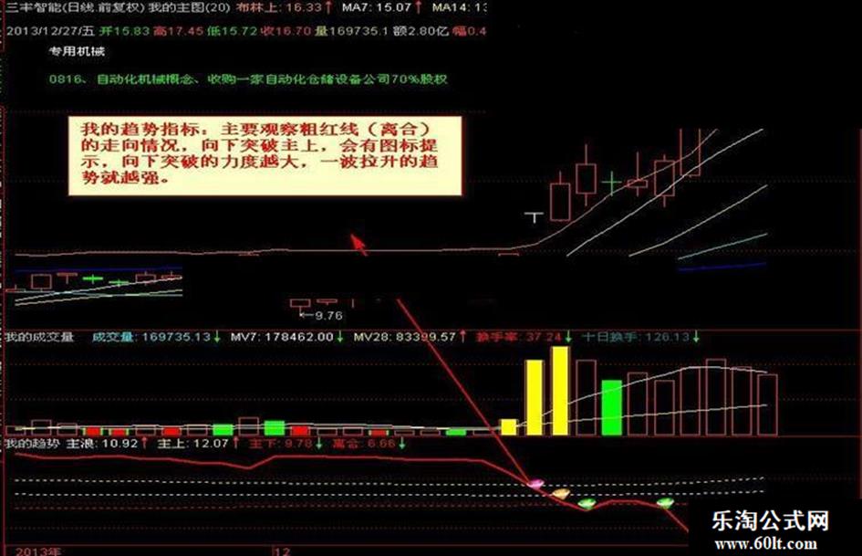我的趋势指标:主要观察粗红线(离合)的走向情况,向下突破主上,会有图标提示,向下突破的力度越大,一波拉升的趋势就越强。